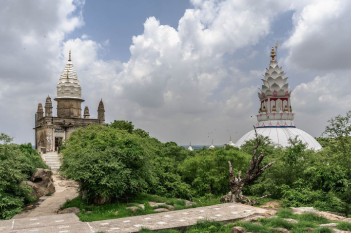 As you approach Sonagiri, the white Jain temples on the hill become visible from a distance, offering a peaceful and spiritual view.